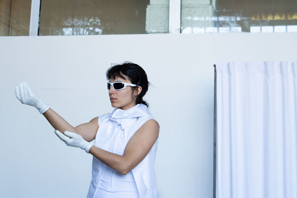 Task, c’est une pièce chorégraphique à trois corps, née de ces questionnements. Une danse du travail, du geste répétitif, inspirée par les environnements blancs, aseptisés et par les gestes de manutention. Trois interprètes répètent le même solo (Lila Abdel-Kader, Diane Réa et moi-même). Un décor simple, clinique, où les objets deviennent outils ou partenaires. Leurs costumes sont identiques : blouse, bottes à plateforme, body short, cagoule, gants, lunettes de soleil — entièrement blancs. Et le décor : cagette, bougies, pompons, rideau de serviette-éponge, blancs également. La pièce est accompagnée d’une composition originale : une techno répétitive créée par Victor Minjard (Drawbridge). L’espace devient un atelier blanc où le corps tente d’accomplir quelque chose d’invisible, une tâche dont on ignore, là encore, le but.
